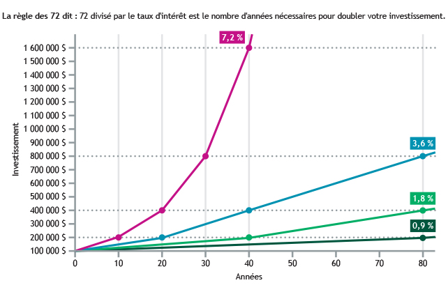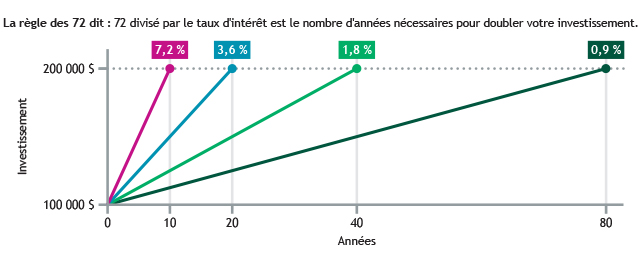 La règle de 72 est une simple approximation du temps nécessaire pour doubler la valeur d’un placement. La règle stipule que vous pouvez estimer le nombre d’années nécessaires en divisant 72 par le taux d’intérêt annuel. Par exemple, si vous avez un investissement à un taux fixe de 7,2 %, il vous faudra environ 10 ans pour doubler votre investissement, car 72 divisé par 7,2 est égal à 10, alors qu’à 3,6 % (la moitié de 7,2 %), il vous faudra 2 fois plus de temps, car 72 divisé par 3,6 est égal à 20, et ainsi de suite.